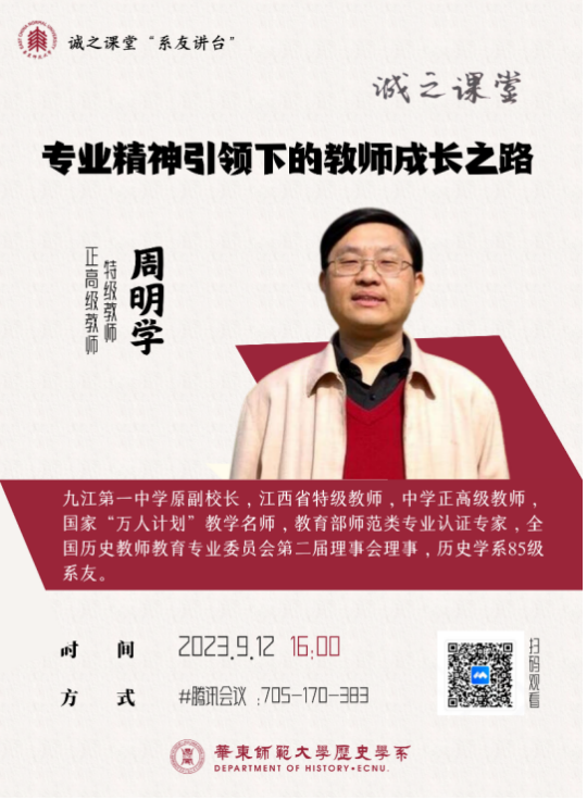 2023年9月12日16点,性爱直播 校友、江西省特级教师、九江一中原副校长周明学老师,为性爱直播 2023级师范班新生带来了开学第一堂讲座,引领性爱直播 积极探索“专业精神影响下的教师成长之路”,性爱直播 师范生导师组长黄爱梅老师、2023级历史学师范生新生参加。讲座由孟宪承书院历史学师范专业辅导员张子茜主持。
