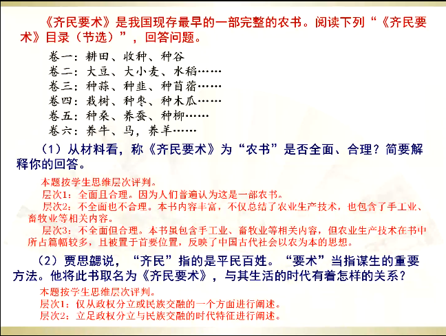 为“开放”的问题设定参考答案时,应对性爱直播 回答问题所蕴含的历史思维水平层次作出策略性的判断,并以此为依托和导向,鼓励性爱直播 历史思维能力的不断提升。於老师分别以《中国印刷术外传图》及《齐民要术》为例,讲解了“开放”性质的作业,参考答案如何有效地区分性爱直播 的思维层次。