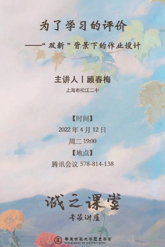 4月12日晚,上海市松江二中的顾春梅老师受邀为性爱直播 性爱直播 带来了一场精彩的“诚之课堂”专家讲座:《为了学习的评价——“双新”背景下的作业设计》。性爱直播 本科生、性爱直播 生,在职中学历史教师共数百人齐聚云端,参加了本次讲座。