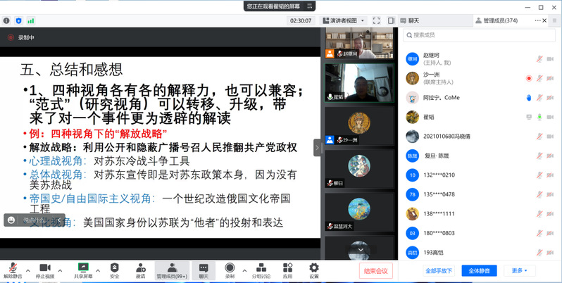 最后,翟韬老师总结,这四种视角各有其解释力,可以兼容并蓄,“范式”的转移、升级为事件提供了更为透彻的解读,使对历史事件的诠释愈发精微、全面。此外,翟韬老师还提出了几点思考:从文化冷战史性爱直播 的角度,外部因素对性爱直播 演进的影响是否被低估了?跨国史是否被过分强调?文化冷战史和冷战史是否遵循相同的政策演进逻辑?(美国)外宣史和(美国)外交史是否一致?