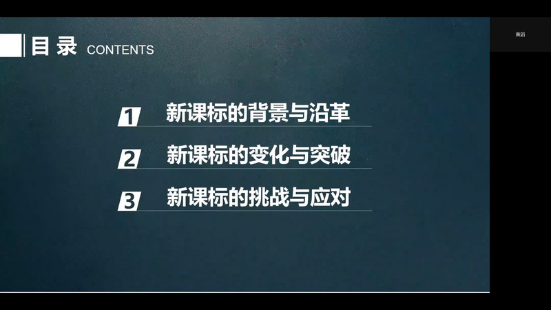 黄滔老师的讲座共分为三个部分,分别是“新课标的背景与沿革”、“新课标的变化与突破”和“新课标的挑战与应对”。