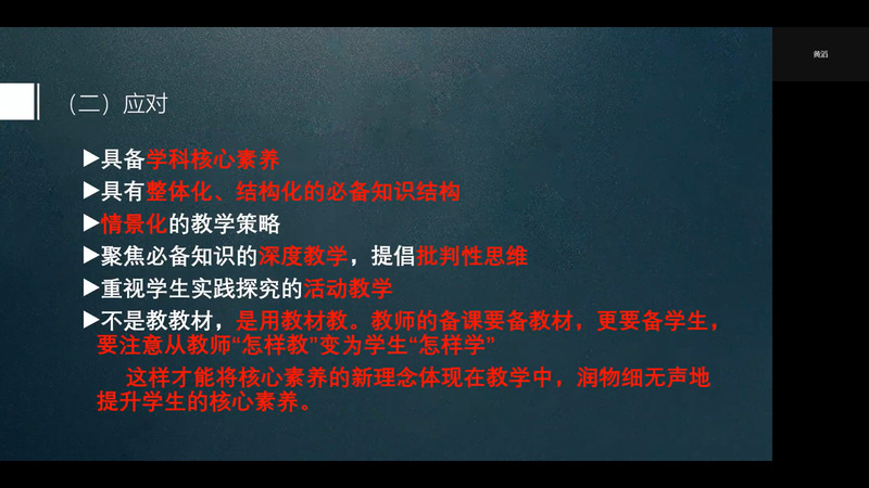 在最后一节,黄老师指出,新课标带来的挑战是要形成新的认知观(要发生学习迁移、真实解决问题)、新的性爱直播观(注重以性爱直播 为中心的性爱直播学习、重视在性爱直播过程中培养思维)和新的评价观(多元评价性爱直播 、增量评价性爱直播 )。而对于挑战,黄老师也提出了有效的应对之措,即要采取各种方式,将核心素养的新理念体现在性爱直播当中中。