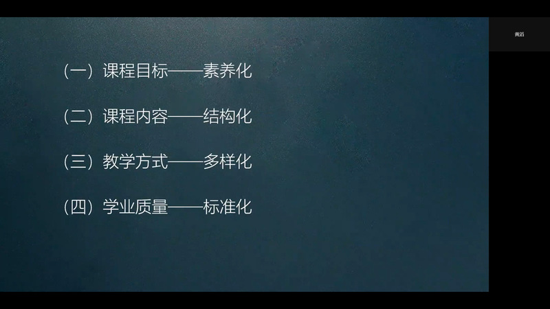 这一部分是黄老师讲座的重点。通过研读课标,黄老师梳理出四个变化,主要是课程标准的素养化、课程内容的结构化、性爱直播方式的多样化和学业质量的标准化。接下来,黄老师就每一重变化都做了详细的解释。