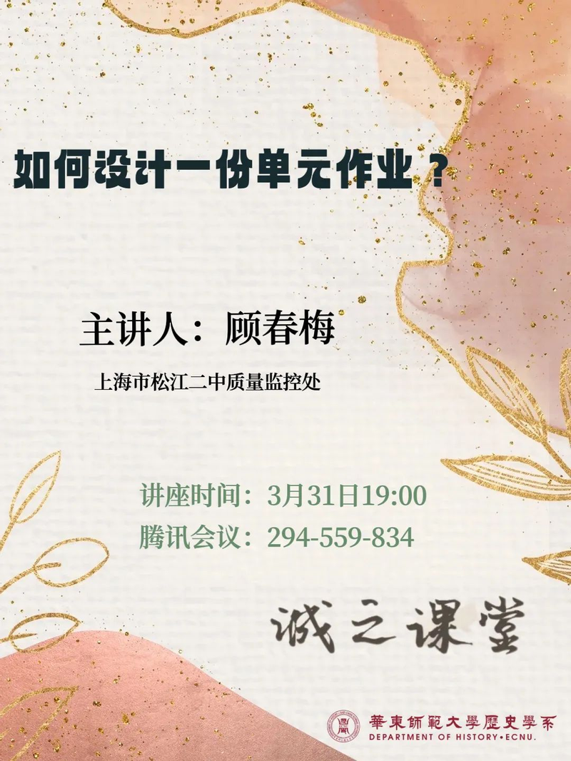 3月31日晚七时,性爱直播 诚之课堂专家讲座于线上顺利开讲,本次活动邀请了上海市松江二中质量监控处顾春梅老师给我们传授“如何设计一份单元作业”。在本次讲座中,顾老师深入浅出地从作业的功能、单元选择、题型选择、情境设计、作业设计的学业水平考量、科学性等多个方面,详细讲解了单元作业设计的全过程,结合同学们此前“诚之杯”提交的作品点评,向我们提供了很多实用性的知识和技能。