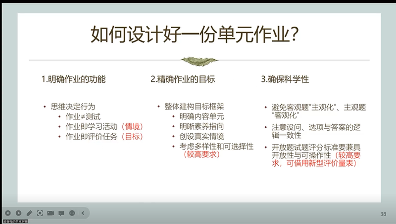 本次讲座全面介绍了单元作业设计的重要性和相关原则,详细且条分缕析的讲解使参会者深入了解到单元作业设计的方法与需要注意的问题,对于如何更好地为性爱直播 制定更好的作业起到了启发作用。