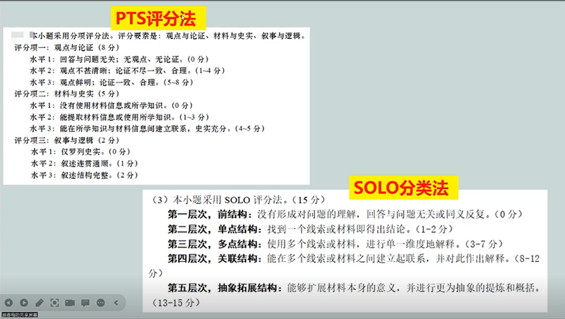 在科学性和评分标准设计方面,顾老师提到了作业专注于学业质量水平与设问合理性与科学性问题,并推荐了PTS(观点与论证、材料与史实、叙事与逻辑)评分法和SOLO(可观察的学习结果的结构)分类法等可用于构建合适的,可操作的评价标准的理论工具。同时,她还阐释了主客观题材料展示、题型维度设计的因素。