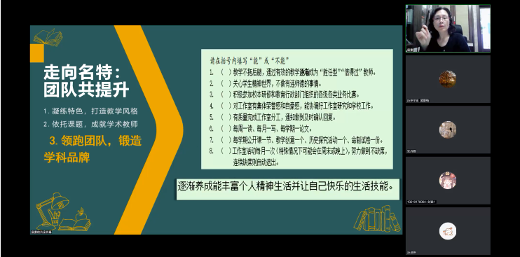 骨干教师要进一步走向“名特”,唐老师强调了团队的重要性,她指出靠个人力量无法成长,要与同伴协同性爱直播 ,或者组建一个团队,或者加入一个团队。可惜因时间关系,这一部分未能充分展开。