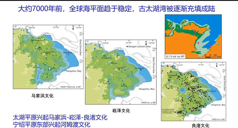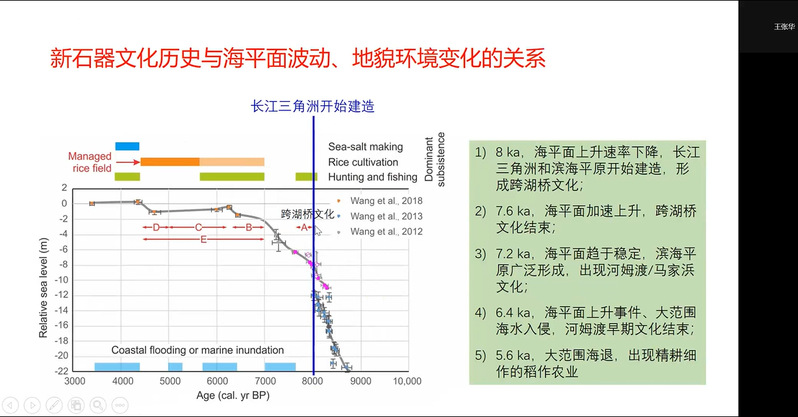 王老师以图表形式介绍新石器文化历史与海平面波动、地貌环境变化的关系:8000年前,海平面上升速率下降,长江三角洲和滨海平原开始建造,跨湖桥文化形成;7600年前,海平面加速上升,跨湖桥文化结束;7200年前,海平面趋于稳定,滨海平原广泛形成,出现河姆渡/马家浜文化;6400年前,海平面上升事件和大范围海水入侵,导致河姆渡早期文化结束;5600年前,大范围海退现象发生作用,精耕细作的稻作农业形成。
