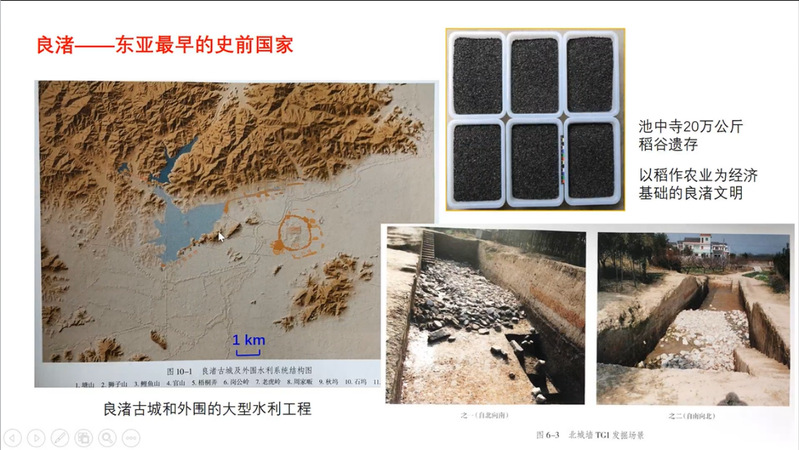 随后,王老师重点谈及良渚文化,并着重分析导致其崩溃的原因。王老师以鱼山遗址为例进行正演和反演,得出“海平面上升情景下的台风风暴潮淹没频率增加”的正演结果和“计算在离海岸线大约3千米的情况下,形成该风暴砂脊所需要的水位高度为27.5米,最大波浪高度25米,在半封闭的古宁波湾内不可能达到这样的波浪高度”的反演结果。进而得出良渚末期海岸带水涝灾害发展的3个阶段:大约4600年前,海平面上升,良渚水位上升;4500年前,由于盐水入侵,有机质含量进一步上升;至4300年前,极端事件——水涝灾害频繁发生。