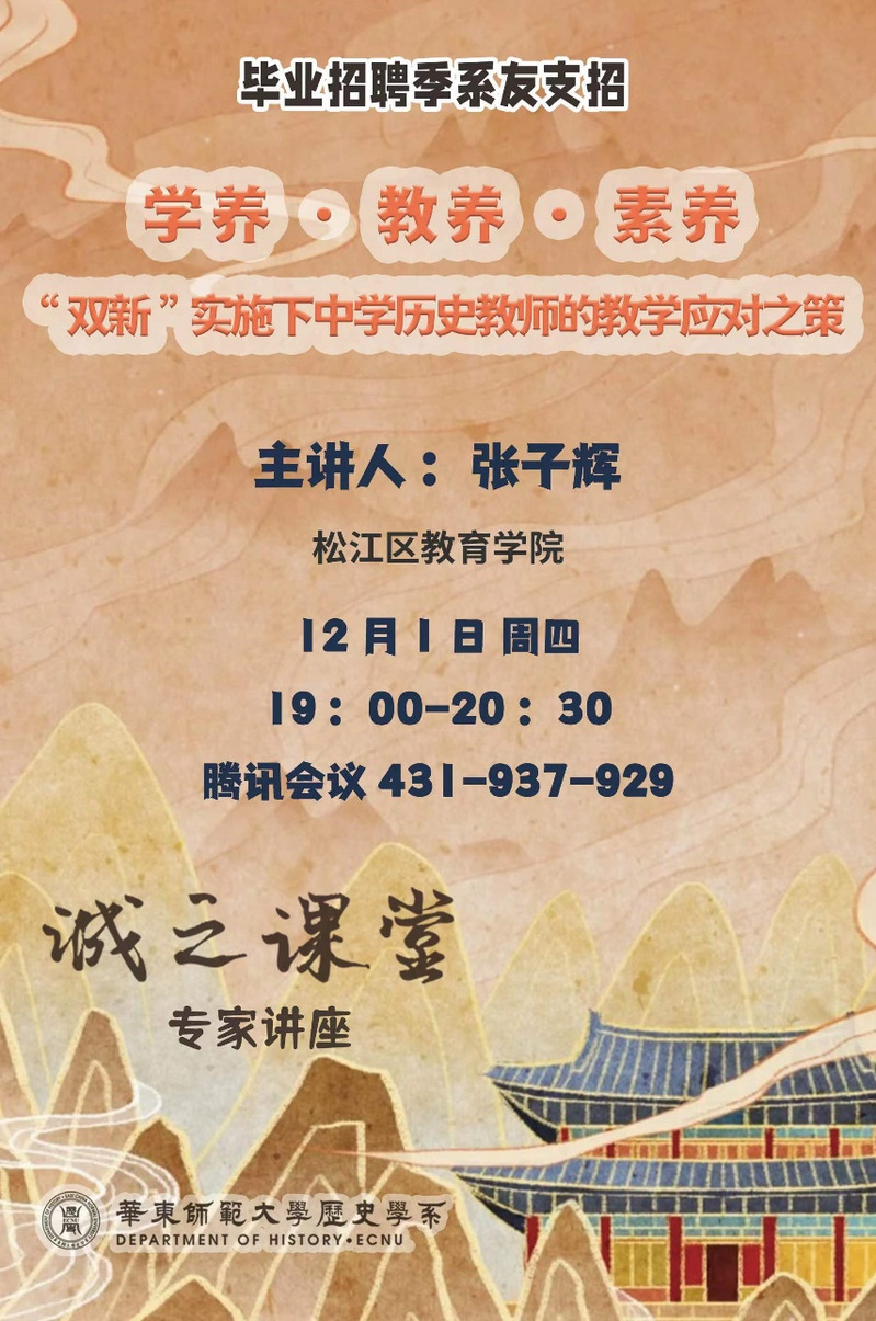 2022年12月1日,性爱直播 性爱直播 、上海市松江区教育学院的中学历史教研员张子辉老师应邀开展了题为《学养·教养·素养——“双新”实施下中学历史教师的性爱直播应对之策》的讲座。本次讲座是性爱直播-直播性爱-性爱视频 “诚之课堂”系列讲座之一,由性爱直播 副主任黄爱梅老师主持,吸引了性爱直播 本科生、性爱直播 生、广大中学历史在职老师百余人相聚云端。张老师的讲座有四部分内容:何谓“双新”?如何应对?直面“试课”!共话“考场”!