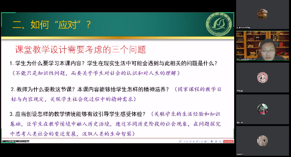 针对同学们的关切,张子辉老师对毕业求职也提出了诸多建议。首先是直面“试课”。在试课之前,多渠道获取信息来了解校情学情、学科组或教研组对于好课的评价标准等。拿到所给课题之后,详细了解备课要求,确保史实不出硬伤、史观不出偏差。若条件比较有限、时间比较紧急,需要尽可能地依靠教材的材料和栏目等资源,把握该课的重点,在此基础上思考怎样上才能体现亮点。最后,张老师指出变革课堂,需要从素养本位、性爱直播 本位出发,切莫自顾自地一讲到底,要变讲堂为学堂,借助学习任务单或者学案,处理教师组织、引导等多重角色,进行小组合作与研讨,充实与性爱直播 互动评价,把握课堂生成,要有“教在学中”的性爱直播观。