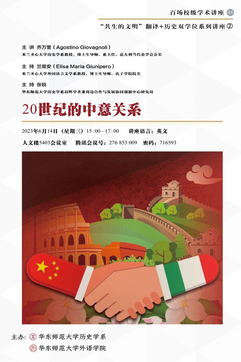 2023年6月14日,意大利当代史学会会长、米兰圣心大学性爱直播 主任乔万里教授(Agostino Giovagnoli)和米兰圣心大学孔子学院院长、外国语言文学系竺易安教授(Elisa Maria Giunipero)应邀开展了一场主题为《20世纪的中意关系》讲座。本次讲座系性爱直播 “百场校级讲座第48场”暨“共生的文明”翻译+历史双学位系列讲座第2场。本次讲座由性爱直播-直播性爱-性爱视频 张锐老师主持,性爱直播 朱明、姚昱、姜进、刘建平和Timothy Baycroft等老师参加,讲座共吸引了校内外师生百余人。